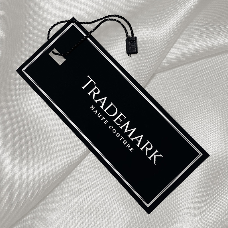 Etiqueta para ropa o diversos tipos de prendas de vestir y calzado, creada de cartón laminado con foil Soft Touch y personalizada con folio plateado. Este modelo de etiqueta está hecho de materiales de alta calidad, utilizando las tecnologías más avanzadas en el campo de la impresión digital y el acabado.