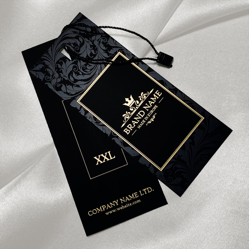 Etiquetas para ropa con diseño Premium y sello de cordón negro, fabricadas en cartón laminado Soft Touch y escritura personalizada con lámina dorada. Este modelo de etiqueta está hecho de materiales de alta calidad, utilizando las tecnologías más avanzadas en el campo de la impresión digital y el acabado.