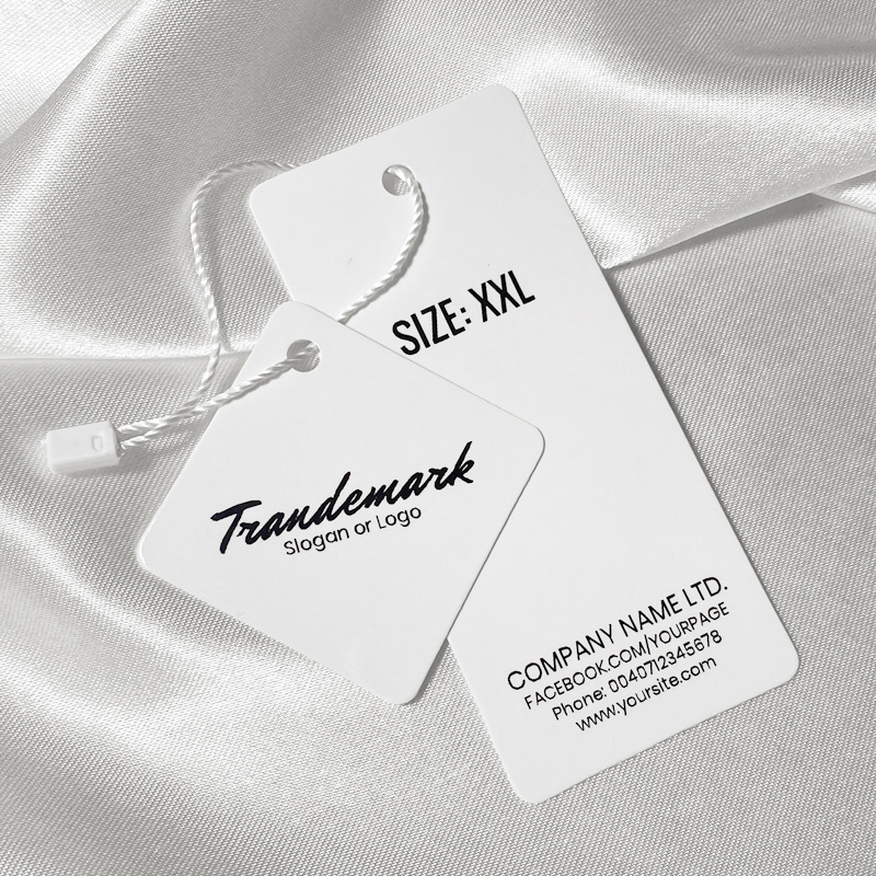 Etiquetas de cartón para ropa con sello blanco, fabricadas en cartón grueso laminado con foil brillo y personalizadas con texto o logo de la Marca. Este modelo de etiqueta está hecho de materiales de alta calidad, utilizando las tecnologías más avanzadas en el campo de la impresión digital y el acabado.