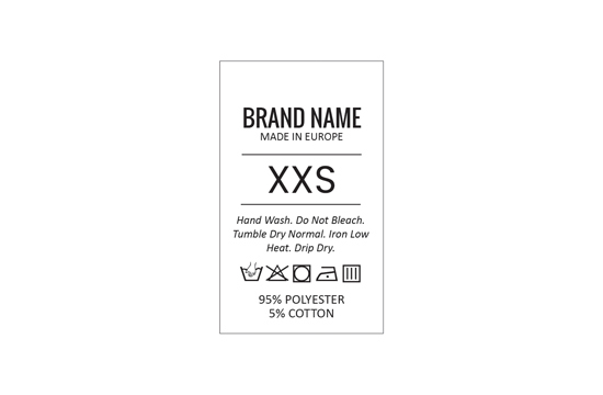 Etiqueta técnica con información sobre la composición del material, las instrucciones de lavado, cuidado y mantenimiento, el nombre del fabricante y el país de fabricación. Este modelo de etiqueta textil se fabrica utilizando las tecnologías más avanzadas en el campo de la impresión digital en medios textiles. Las etiquetas están impresas en satén especial, por el método de transferencia térmica, con una calidad de impresión impresionante y alta resistencia al lavado.