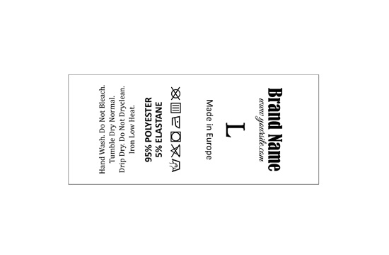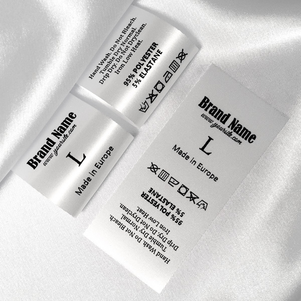 Etiqueta de composición hecha de satén que contiene información sobre el tamaño, textos y signos de lavado y mantenimiento, pero también el nombre de Marca, adecuada para la ropa. Este modelo de etiqueta textil se fabrica utilizando las tecnologías más avanzadas en el campo de la impresión digital en medios textiles. Las etiquetas están impresas en satén especial, por el método de transferencia térmica, con una calidad de impresión impresionante y alta resistencia al lavado.