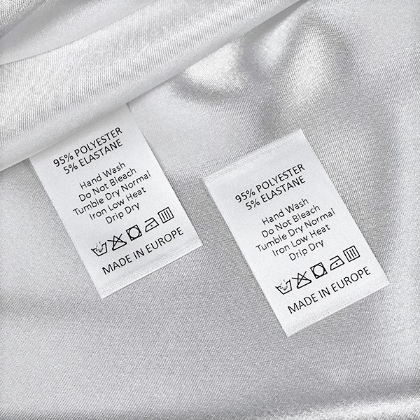 Etiqueta para el cuidado de la ropa, con símbolos de mantenimiento y lavado, personalizada con el nombre de la marca y la composición del material, impresa en fino satén blanco. Este modelo de etiqueta textil se fabrica utilizando las tecnologías más avanzadas en el campo de la impresión digital en medios textiles. Las etiquetas están impresas en satén especial, por el método de transferencia térmica, con una calidad de impresión impresionante y alta resistencia al lavado.
