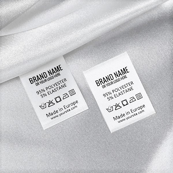 Etiqueta de cuidado de la ropa personalizada con el nombre de la marca, la composición del tejido y los símbolos de lavado y cuidado, impresa en raso blanco y cortada por ultrasonidos en los bordes. Este modelo de etiqueta textil se fabrica utilizando las tecnologías más avanzadas en el campo de la impresión digital en medios textiles. Las etiquetas están impresas en satén especial, por el método de transferencia térmica, con una calidad de impresión impresionante y alta resistencia al lavado.