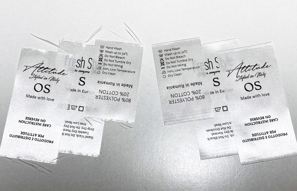 Etiqueta textil con símbolos de lavado y cuidado, e información sobre la composición del material, personalizada en un fino satén de alta calidad, cortado en caliente por ultrasonidos. Este modelo de etiqueta textil se fabrica utilizando las tecnologías más avanzadas en el campo de la impresión digital en medios textiles. Las etiquetas están impresas en satén especial, por el método de transferencia térmica, con una calidad de impresión impresionante y alta resistencia al lavado.
