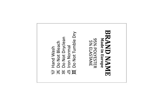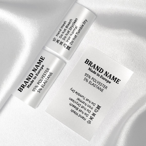 Etiqueta de composición hecha de fino satén blanco, impreso con textos personalizados en negro, adecuada para varias prendas de vestir. Este modelo de etiqueta textil se fabrica utilizando las tecnologías más avanzadas en el campo de la impresión digital en medios textiles. Las etiquetas están impresas en satén especial, por el método de transferencia térmica, con una calidad de impresión impresionante y alta resistencia al lavado.