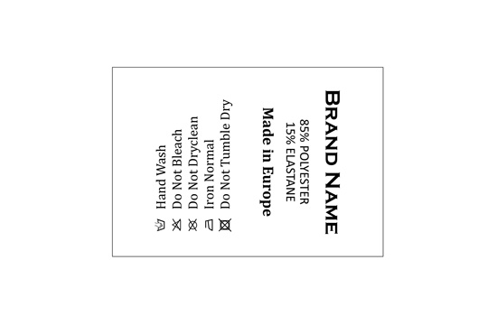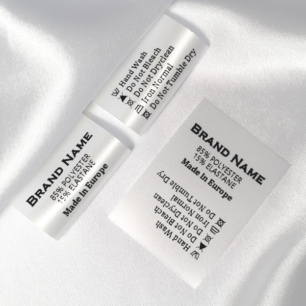 Etiqueta de composición personalizada con instrucciones de lavado y mantenimiento, adecuada para diferentes prendas de vestir. Este modelo de etiqueta textil se fabrica utilizando las tecnologías más avanzadas en el campo de la impresión digital en medios textiles. Las etiquetas están impresas en satén especial, por el método de transferencia térmica, con una calidad de impresión impresionante y alta resistencia al lavado.