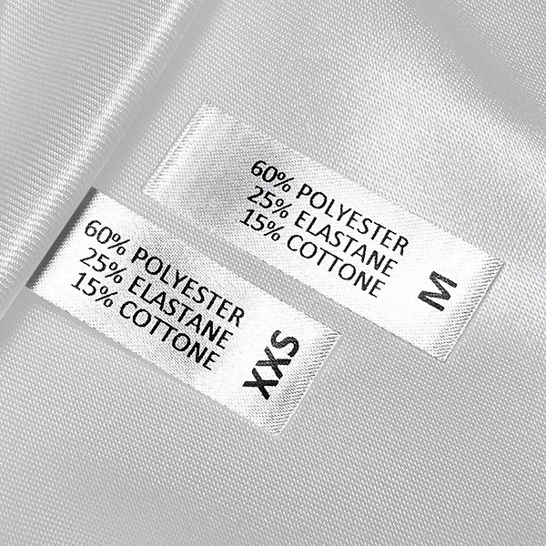 Etiqueta de mantenimiento con tallas hecha por encargo en raso de primera calidad, con los datos sobre la composición del material, para coser sobre la ropa. Este modelo de etiqueta textil se fabrica utilizando las tecnologías más avanzadas en el campo de la impresión digital en medios textiles. Las etiquetas están impresas en satén especial, por el método de transferencia térmica, con una calidad de impresión impresionante y alta resistencia al lavado.