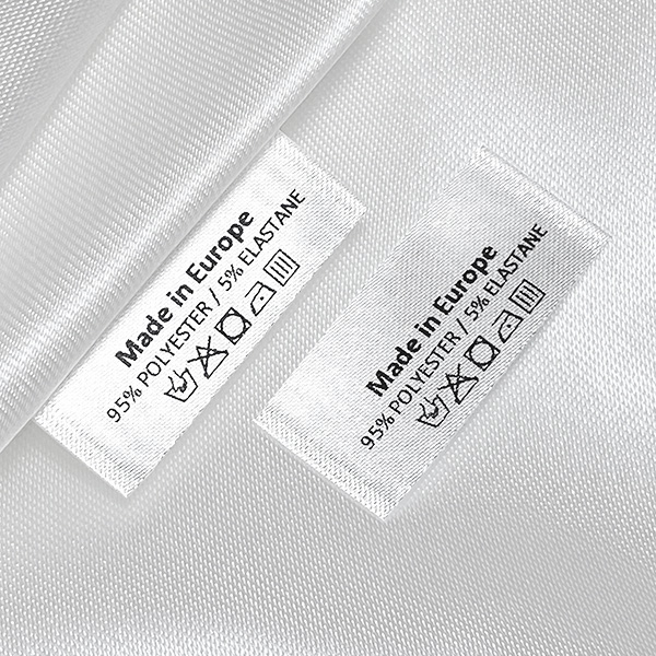Etiqueta de raso personalizada con símbolos de lavado y cuidados del material textil del que está confeccionada la prenda, para coser en la ropa. Este modelo de etiqueta textil se fabrica utilizando las tecnologías más avanzadas en el campo de la impresión digital en medios textiles. Las etiquetas están impresas en satén especial, por el método de transferencia térmica, con una calidad de impresión impresionante y alta resistencia al lavado.