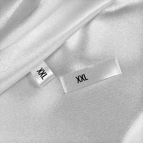 Etiqueta de talla para coser en forma de pliegue en una prenda, fabricada en material textil blanco y fino. Este modelo de etiqueta textil se fabrica utilizando las tecnologías más avanzadas en el campo de la impresión digital en medios textiles. Las etiquetas están impresas en satén especial, por el método de transferencia térmica, con una calidad de impresión impresionante y alta resistencia al lavado.