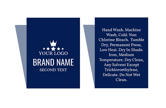 Etiqueta personalizada doblada en el medio, bordada en un material textil modelo Majestic Style, personalizada con indicador de tamaño, marca, composición y texto de mantenimiento, y un logo/emblema. Este modelo de etiqueta textil está hecho de materiales de alta calidad, utilizando las tecnologías más avanzadas en el campo del bordado digital a nivel industrial.